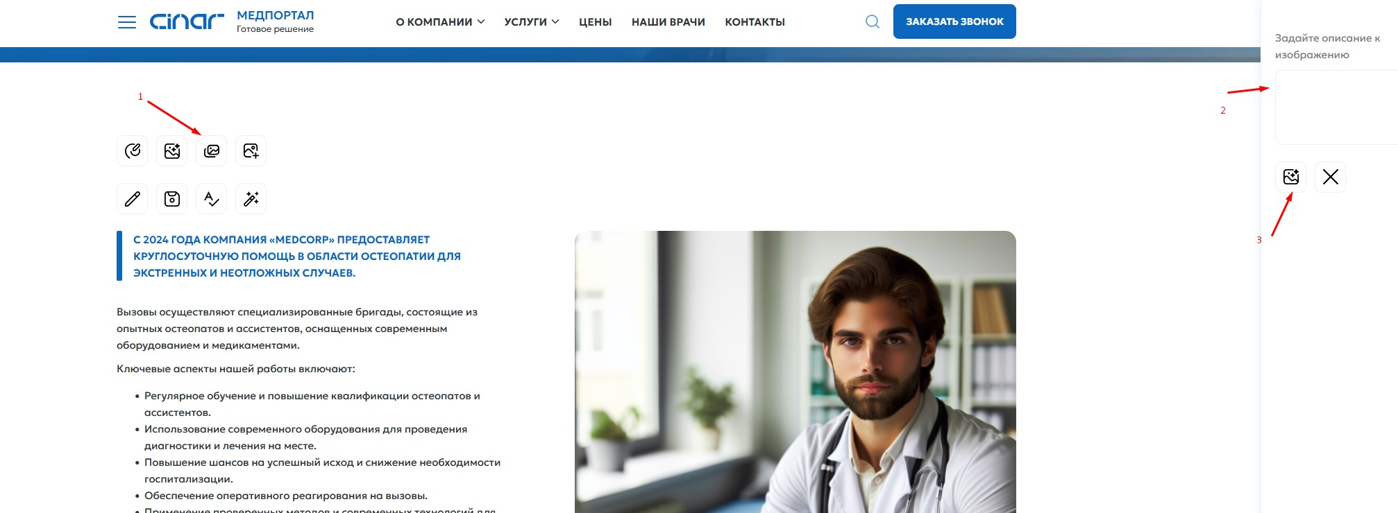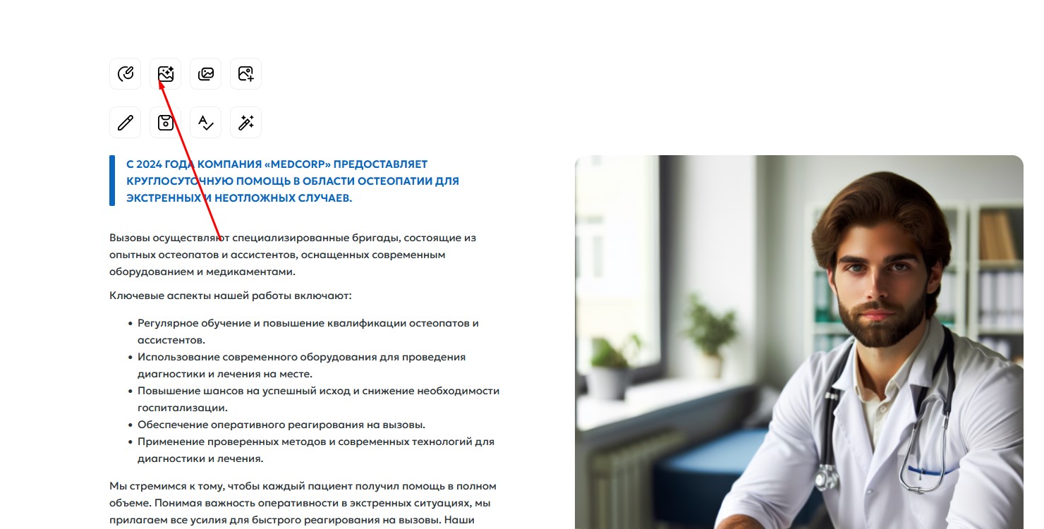 Иконка указаная ниже создает изображение на основе контекста страницы, то есть в один клик без описания. Данная функция может создавать очень неточные изображения, однако позволяет заполнять быстро сайт демо контентом.